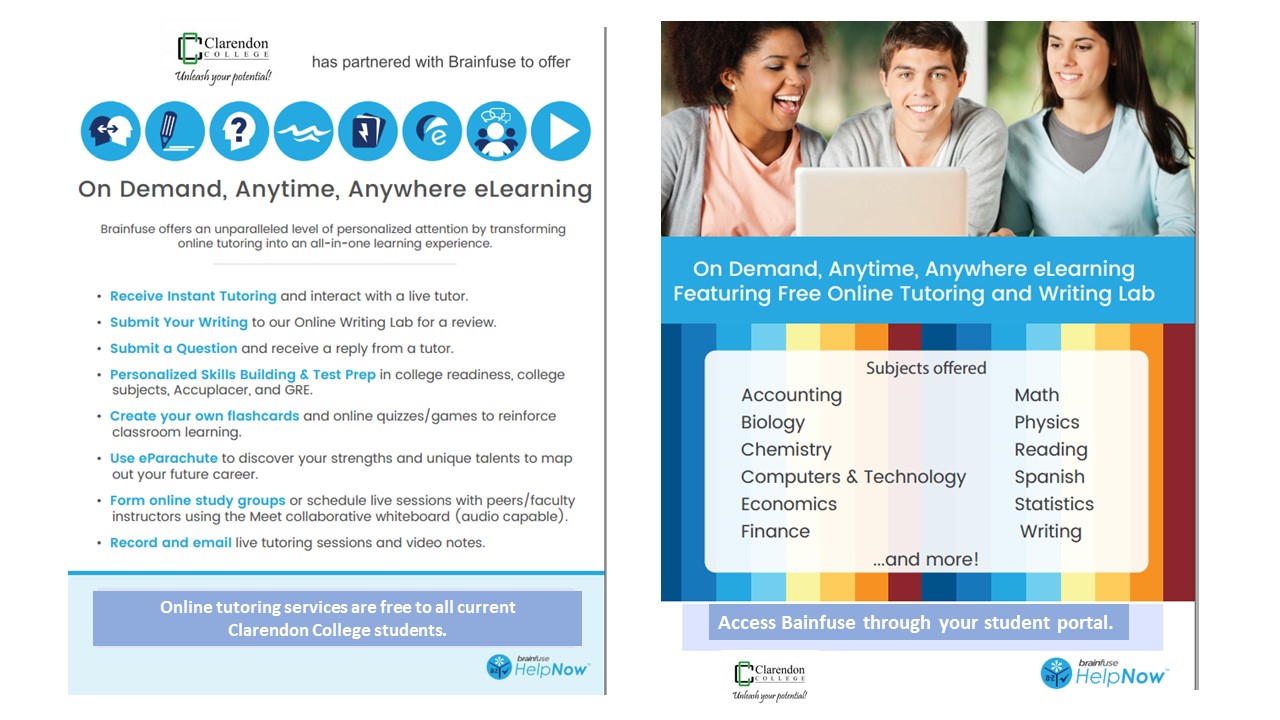 Attention CC Students: One of the great resources we have available for you is our on-line tutoring platform Brainfuse. You can access Brainfuse from any computer as long as you have an internet connection. You can get immediate help from a professional Brainfuse tutor for just about any subject we offer. Brainfuse is free to use and is available 24 hours a day for your convenience. Just scroll down to the Brainfuse help section for more information or access it through your student portal.