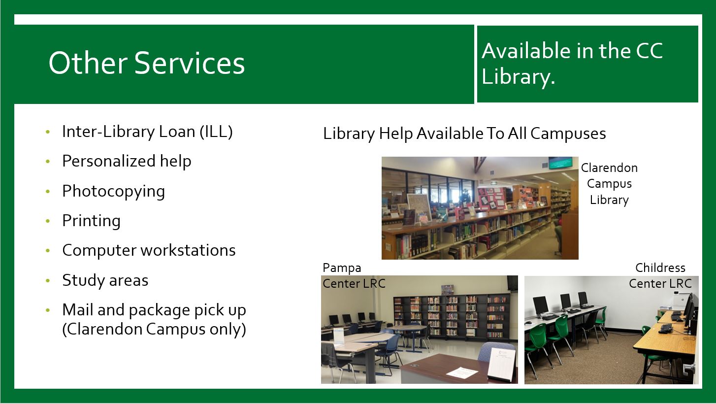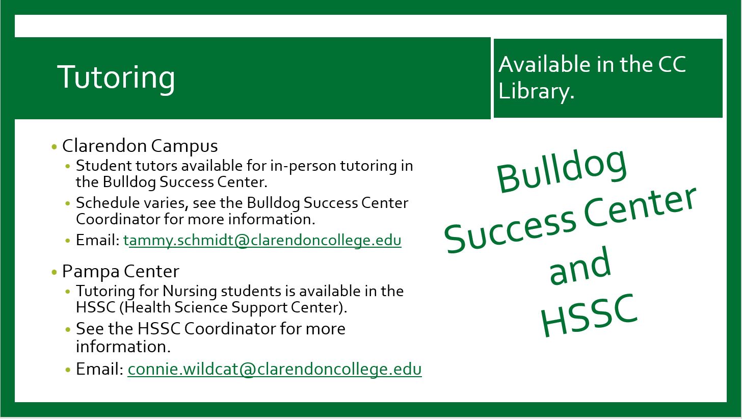 Contact Information Phone: 806.874.4815 Toll-Free: 800.687.9737 ext. 115, 116 Fax: 806.874.5080 1122 College Dr. Clarendon, Tx 79226 Library Fall and Spring Hours Monday - Thursday • 9:00 a.m.- 8:00 p.m. Friday • 9:00 a.m.- 3:00 p.m. See Bulldog Success Center Homepage for Success Center Hours